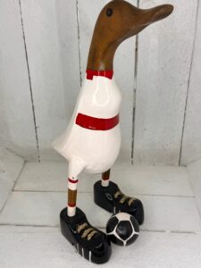 Diese handgefertigte Laufente ist im sportlichen Rot-Weiß-Design gehalten und eignet sich ideal als dekoratives Highlight für Fans, Sammler und alle, die humorvolle Deko lieben.