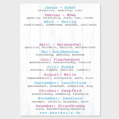 Monat und Sternzeichen sind auf der Vorderseite der Karte gekennzeichnet.