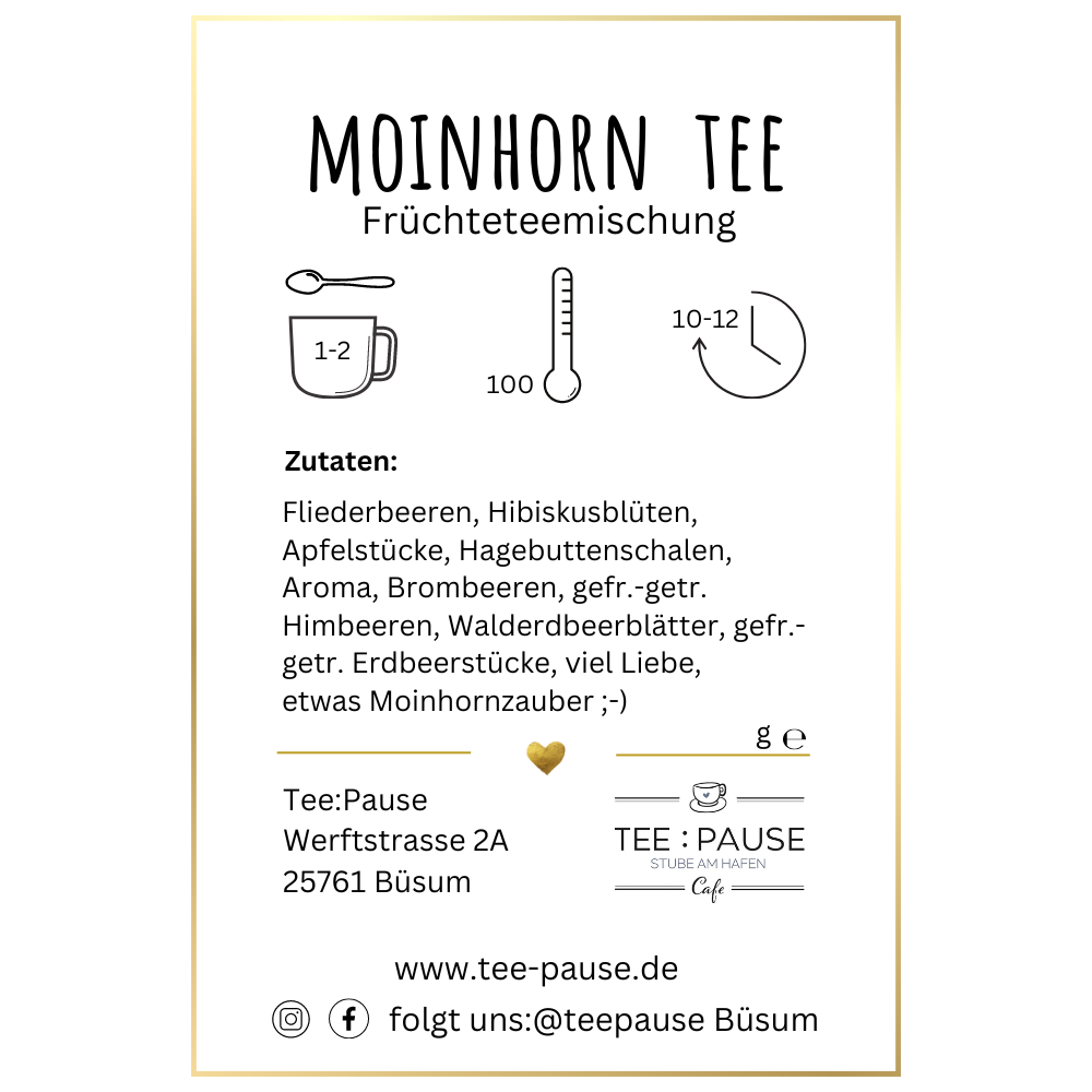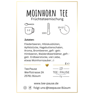 Fliederbeeren, Hibiskusblüten, Apfelstücke, Hagebuttenschalen, Aroma, Brombeeren, gefr.-getr.,Himbeeren, Walderdbeerblätter, gefr.-getr. Erdbeerstücke, viel Liebe, etwas Moinhornzauber 😉