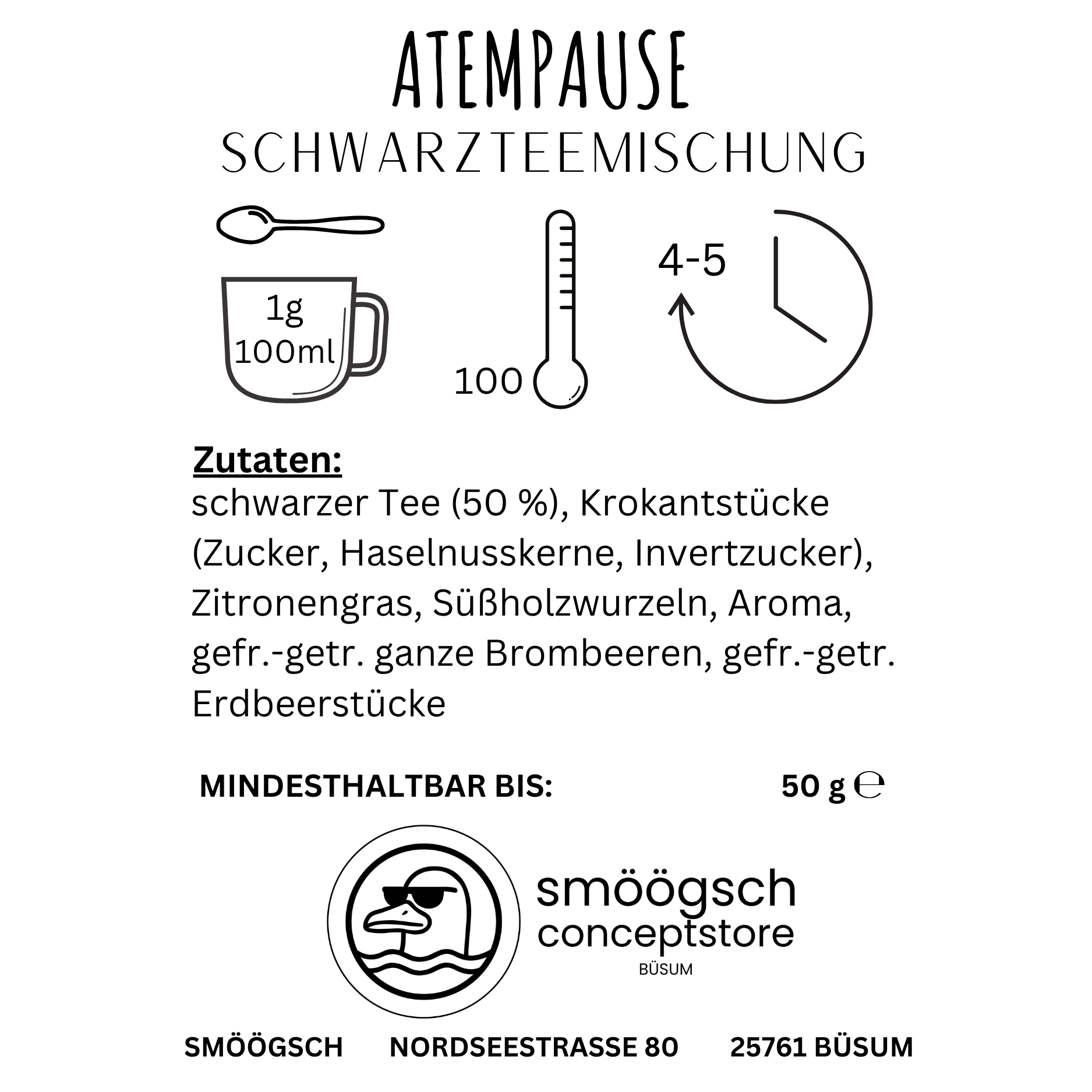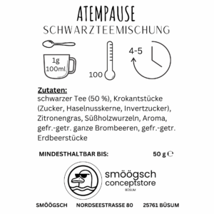 schwarzer Tee (50 %), Krokantstücke (Zucker, Haselnusskerne, Invertzucker), Zitronengras, Süßholzwurzeln, Aroma, gefr.-getr. ganze Brombeeren, gefr.-getr. Erdbeerstücke