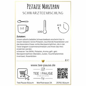 schwarzer Tee (90%), Pistazien, Aroma, gefr.-getr. Marzipantröpfchen (Mandeln, Zucker, Feuchthaltemittel: Invertase), Rosenblüten