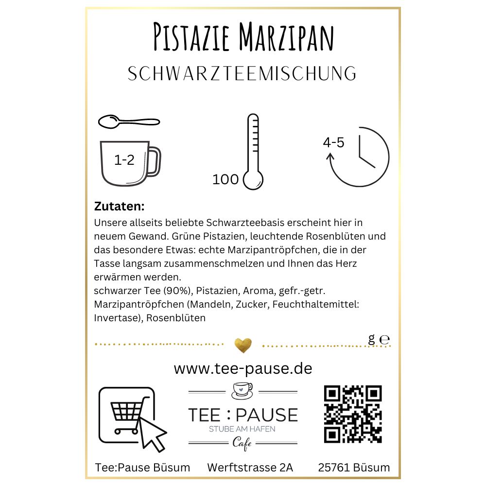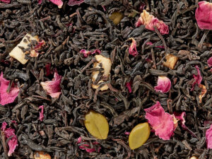 Unsere allseits beliebte Schwarzteebasis erscheint hier in neuem Gewand. Grüne Pistazien, leuchtende Rosenblüten und das besondere Etwas: echte Marzipantröpfchen, die in der Tasse langsam zusammenschmelzen und Ihnen das Herz erwärmen werden.