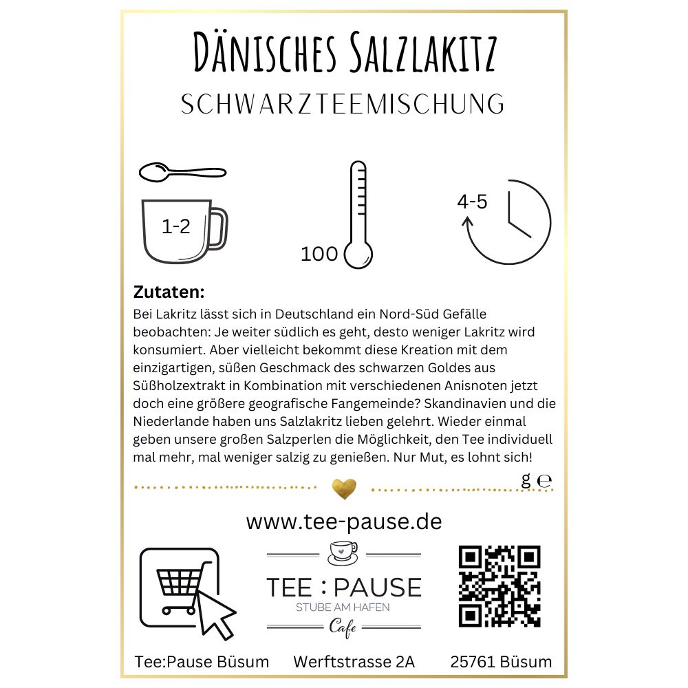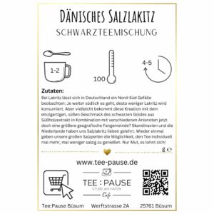 Bei Lakritz lässt sich in Deutschland ein Nord-Süd Gefälle beobachten: Je weiter südlich es geht, desto weniger Lakritz wird konsumiert. Aber vielleicht bekommt diese Kreation mit dem einzigartigen, süßen Geschmack des schwarzen Goldes aus Süßholzextrakt in Kombination mit verschiedenen Anisnoten jetzt doch eine größere geografische Fangemeinde? Skandinavien und die Niederlande haben uns Salzlakritz lieben gelehrt. Wieder einmal geben unsere großen Salzperlen die Möglichkeit, den Tee individuell mal mehr, mal weniger salzig zu genießen. Nur Mut, es lohnt sich!