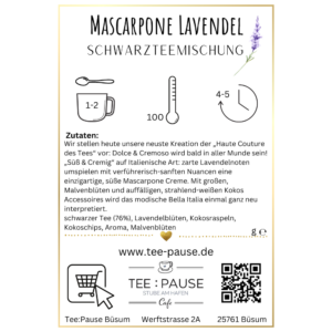 Wir stellen heute unsere neuste Kreation der „Haute Couture des Tees“ vor: Dolce & Cremoso wird bald in aller Munde sein! „Süß & Cremig“ auf Italienische Art: zarte Lavendelnoten umspielen mit verführerisch-sanften Nuancen eine einzigartige, süße Mascarpone Creme. Mit großen, violetten Malvenblüten und auffälligen, strahlend-weißen Kokos Accessoires wird das modische Bella Italia einmal ganz neu interpretiert.