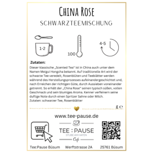 Dieser klassische „Scented Tea“ ist in China auch unter dem Namen Meigui Hongcha bekannt. Auf traditionelle Art wird der schwarze Tee veredelt, Rosenblüten und Teeblätter werden während des Herstellungsprozesses aufeinandergeschichtet und, nach Erreichen der richtigen Güte, durch Aussieben voneinander getrennt. So erhält der „China Rose“ seinen typisch süßen, vollen Geschmack und sein blumiges Aroma. Kenner verfeinern seine duftige Note durch einen Spritzer Sahne oder Milch.