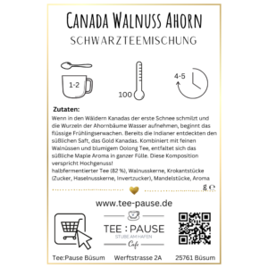 Wenn in den Wäldern Kanadas der erste Schnee schmilzt und die Wurzeln der Ahornbäume Wasser aufnehmen, beginnt das flüssige Frühlingserwachen. Bereits die Indianer entdeckten den süßlichen Saft, das Gold Kanadas. Kombiniert mit feinen Walnüssen und blumigem Oolong Tee, entfaltet sich das süßliche Maple Aroma in ganzer Fülle. Diese Komposition verspricht Hochgenuss!