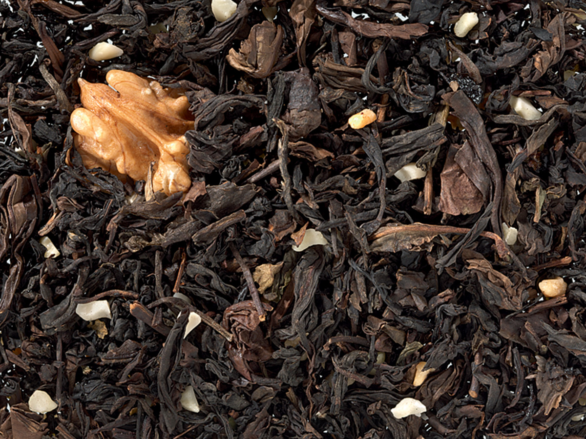 halbfermentierter Tee (82 %), Walnusskerne, Krokantstücke (Zucker, Haselnusskerne, Invertzucker), Mandelstücke, Aroma