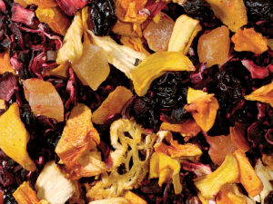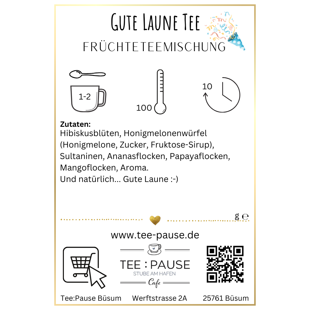 Hibiskusblüten, Honigmelonenwürfel (Honigmelone, Zucker, Fruktose-Sirup), Sultaninen, Ananasflocken, Papayaflocken, Mangoflocken, Aroma.