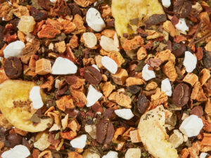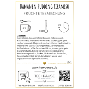 Alles Banane! Nicht ganz.. diese Früchteteekreation ist dem trendigen, amerikanischen Sahne-Dessert nachempfunden. Süß-sahniger Schmelz mit reifer Banane und einer cremigen Puddingschicht getoppt mit etwas Kakaopulver: Dies ist nicht nur für echte Naschkatzen eine himmlische Verführung. Optisch dominieren große Bananenscheiben, weißes Joghurtgranulat und Kaffeebohnen die Mischung.