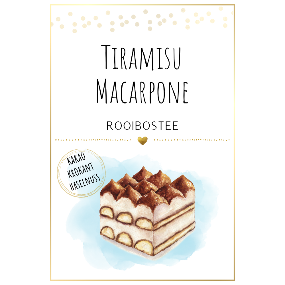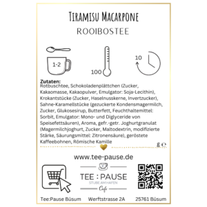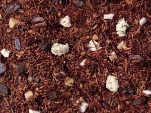 Zutaten: Rotbuschtee, Schokoladenplättchen (Zucker, Kakaomasse, Kakaopulver, Emulgator: Soja-Lecithin), Krokantstücke (Zucker, Haselnusskerne, Invertzucker), Sahne-Karamellstücke (gezuckerte Kondensmagermilch, Zucker, Glukosesirup, Butterfett, Feuchthaltemittel: Sorbit, Emulgator: Mono- und Diglyceride von Speisefettsäuren), Aroma, gefr.-getr. Joghurtgranulat (Magermilchjoghurt, Zucker, Maltodextrin, modifizierte Stärke, Säurungsmittel: Zitronensäure), geröstete Kaffeebohnen, Römische Kamille