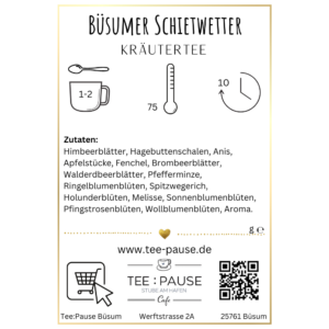 Zutaten: Rotbuschtee, Fenchel, Melissenblätter, Kokoschips, Sanddornbeeren, kandierte Aloe Vera (Aloe Vera, Zucker), Kamille, Kurkumascheiben, süße Brombeerblätter, Pfefferminze, blaue Kornblumenblüten, Chlorella Algenpulver (1 %).