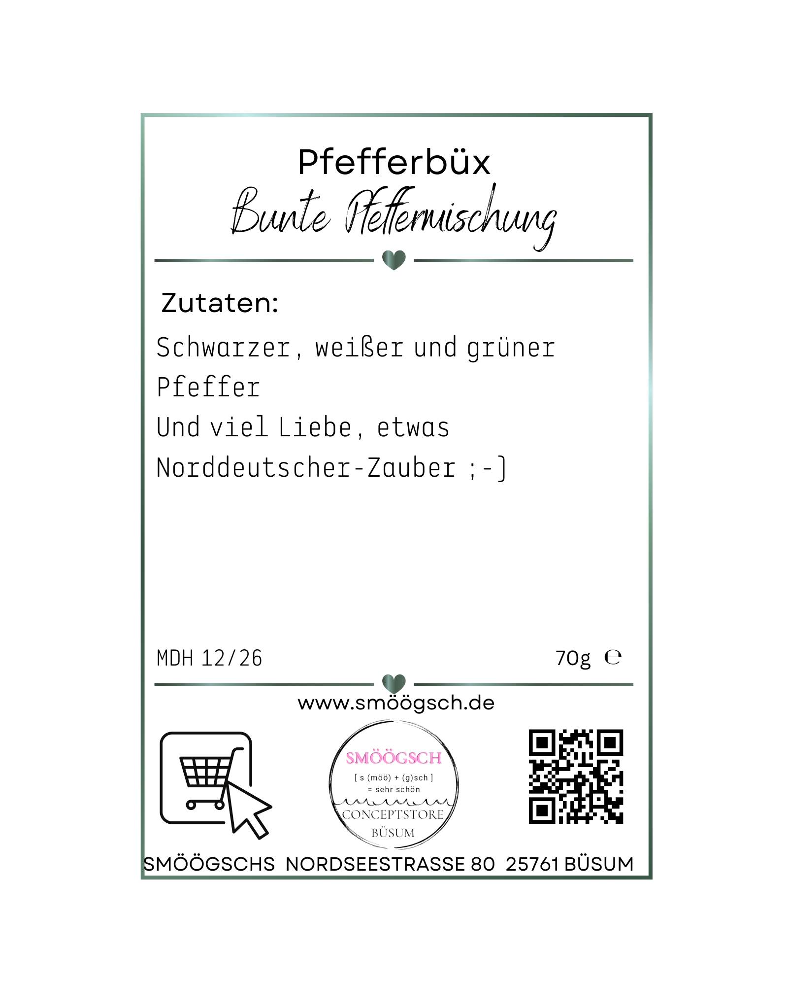 Hier kommt sie, die Pfefferbüx – direkt vom Deich, scharf wie ein Nordseesturm und bunt wie ein Sonnenuntergang überm Watt. Eine Mischung aus schwarzem, weißem und grünem Pfeffer, die ordentlich Wind in deine Küche bringt!