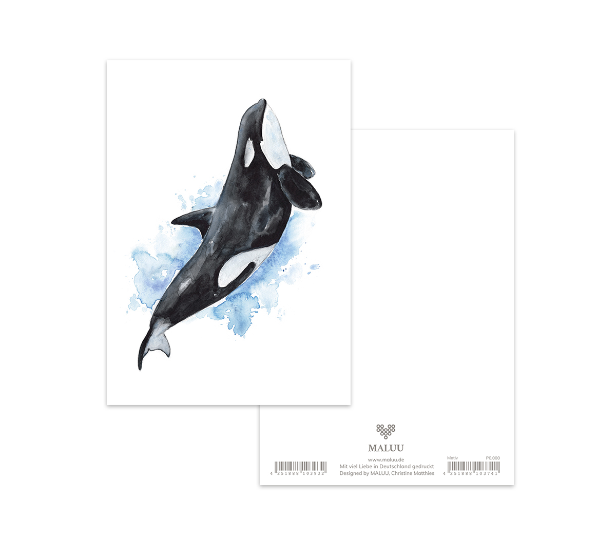Liebevoll handgemaltes und einzigartiges Aquarell-Design „Orca Splash“ von Christine Matthies