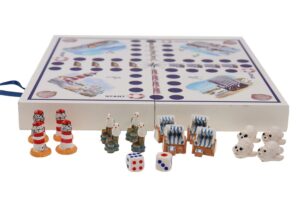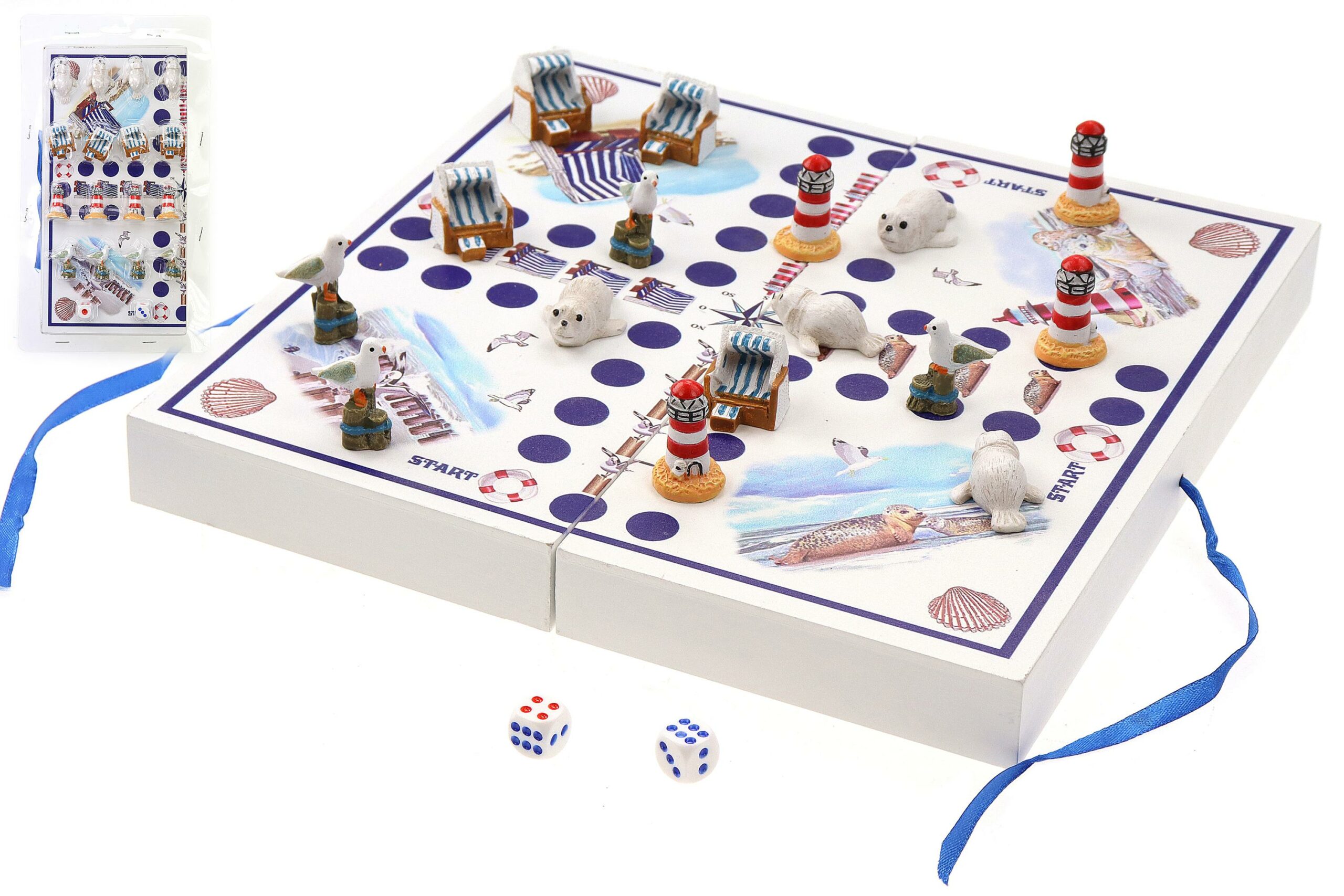 - LIEFERUMFANG: Das Spielbrett besteht aus Holz, die Figuren und die Würfel bestehen aus Kunststoff. Inhalt: 1 Spielbrett, 2 Würfel, 16 Spielfiguren (4x Leuchtturm, 4x Strandkorb, 4x Möwe, 4x Robbe).