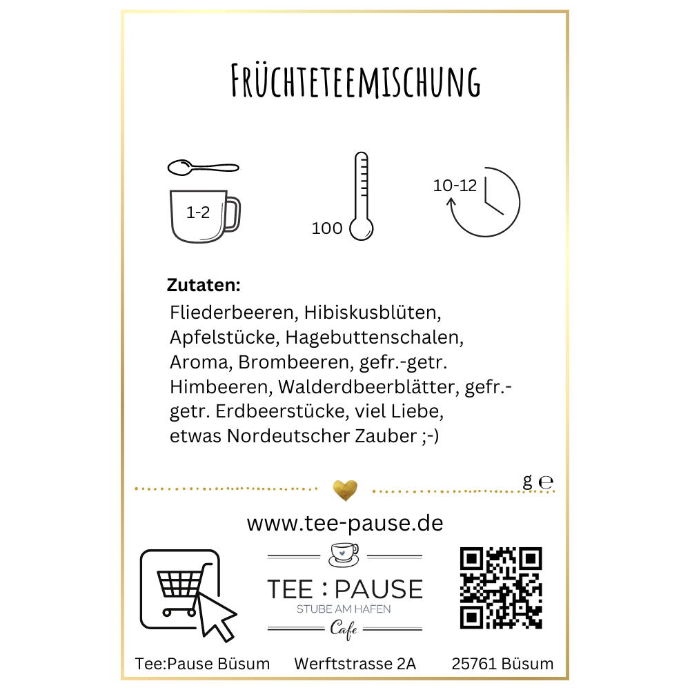 Zutaten: Fliederbeeren, Hibiskusblüten, Apfelstücke, Hagebuttenschalen, Aroma, Brombeeren, gefr.-getr.,Himbeeren, Walderdbeerblätter, gefr.-getr. Erdbeerstücke, viel Liebe, etwas Moinhornzauber 😉