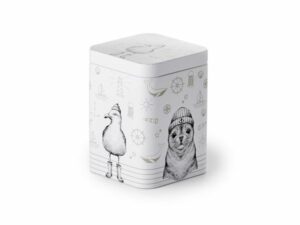 Ahoi Matrosen! Ob brausender Nordwind oder schäumender Wellengang, die beiden Küstenkinder „Jore & Ville“ trotzen jedem tosenden Sturm. Und hierfür sind sie bestens ausgerüstet. So sorgen kniehohe Gummistiefel für trockene Füße und eine flauschige Wollmütze für warme Ohren. Dann heißt es für die beiden nur noch: Kurs halten und abwarten bis sich die wilde See wieder beruhigt. Und schnell wird der starke Wind zur leichten, salzigen Brise, die strahlende Sonne erscheint am Horizont und die Robbe „Jore“ macht es sich auf einer Sandbank gemütlich, während die Möwe „Ville“ sich ein bequemes Plätzchen auf einer schönen Duckdalbe in ihrem Heimathafen sucht. Dieses charmante Design im Stil einer Bleistiftzeichnung überzeugt durch viel Liebe zum Detail! Ob witzige Dekorelemente, wie Gummistiefel und Wollmütze, die jedermann ein Schmunzeln ins Gesicht zaubern, oder die feine und aufwändige Gestaltung von Möwe und Robbe, die ihresgleichen sucht. Diese Dose ist ein absolutes Highlight, dass sich auf mehreren Ebenen von anderen Artikeln abhebt und so zum attraktiven Hingucker wird. Auch die maritimen, detaillreichen Designelemente wie Steuerrad, Wal und Leuchtturm, die das Dekor im Patternstil umgeben, zahlen auf die einzigartige Optik des Produkts ein und unterstreichen den gelungenen Look. Mit den Maßen 7,3 x 7,3 x 10 cm eignet sich die Dose ideal zur Aufbewahrung von ca. 100 g Tee. Die moderne Artikelform, mit nach innen gerolltem Deckelrand, erhält durch die matte Oberflächenveredelung einen besonderen Touch. Ob beim Schiffskoch in der Kombüse oder dem Leichtmatrosen mit Ankerplatz in der heimischen Küche, diese Dose macht überall eine gute Figur!