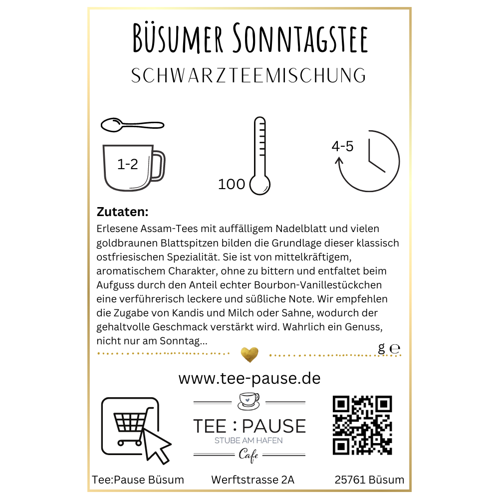 Ein Highlight unter den ostfriesischen Teespezialitäten ist der traditionelle Sonntagstee. Erlesenen Assamtees mit schönem Nadelblatt werden feinste Bourbon-Vanillestückchen hinzugefügt. Das ergibt eine mittelkräftige, nicht sehr bitternde Mischung mit einer verführerisch leckeren, süßlichen Note. Auch hierzu empfehlen wir die Zugabe von Kandis und Milch oder Sahne.